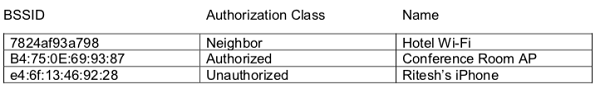 · # 類型 = 默認(rèn)、未知、未經(jīng)授權(quán)、鄰居、已標(biāo)記、已授權(quán)的 BSSID 授權(quán)類名