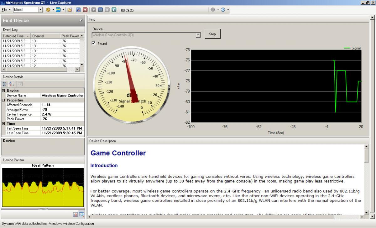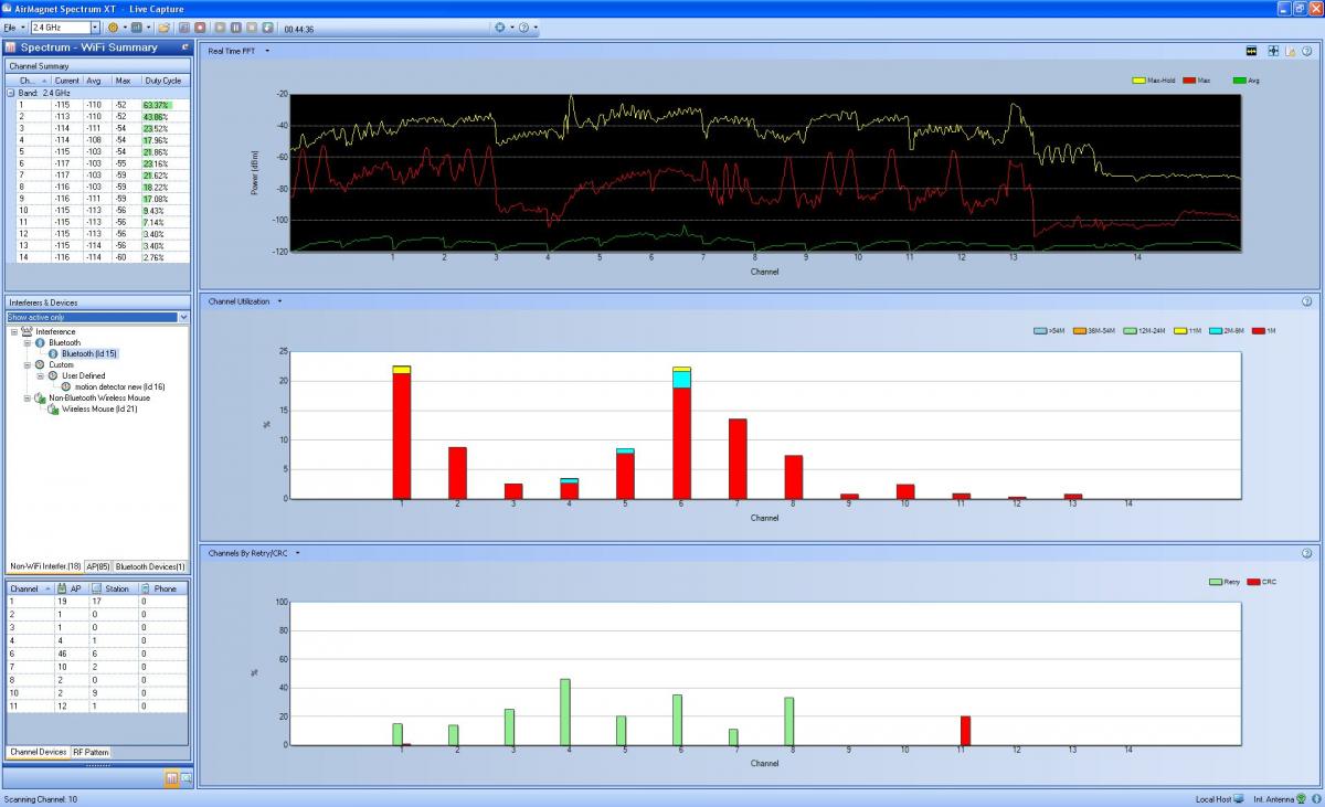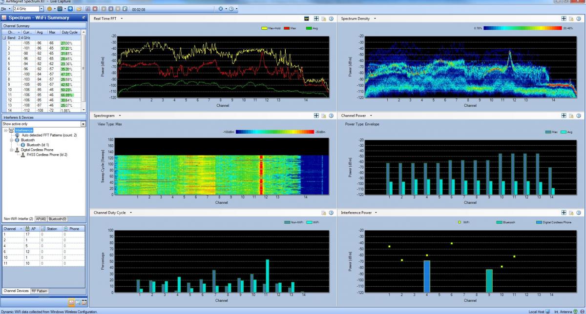 AirMagnet Spectrum XT 可實(shí)時檢測和識別一系列干擾和降低無線網(wǎng)絡(luò)性能的非 Wi-Fi 干擾源。設(shè)備或干擾源名單包括藍(lán)牙設(shè)備、數(shù)字和模擬無繩電話、傳統(tǒng)和變頻微波爐、無線游戲控制器、數(shù)字視頻轉(zhuǎn)換器、嬰兒監(jiān)視器、RF 干擾發(fā)射臺、雷達(dá)、運(yùn)動探測器和 zigbee 設(shè)備等等。