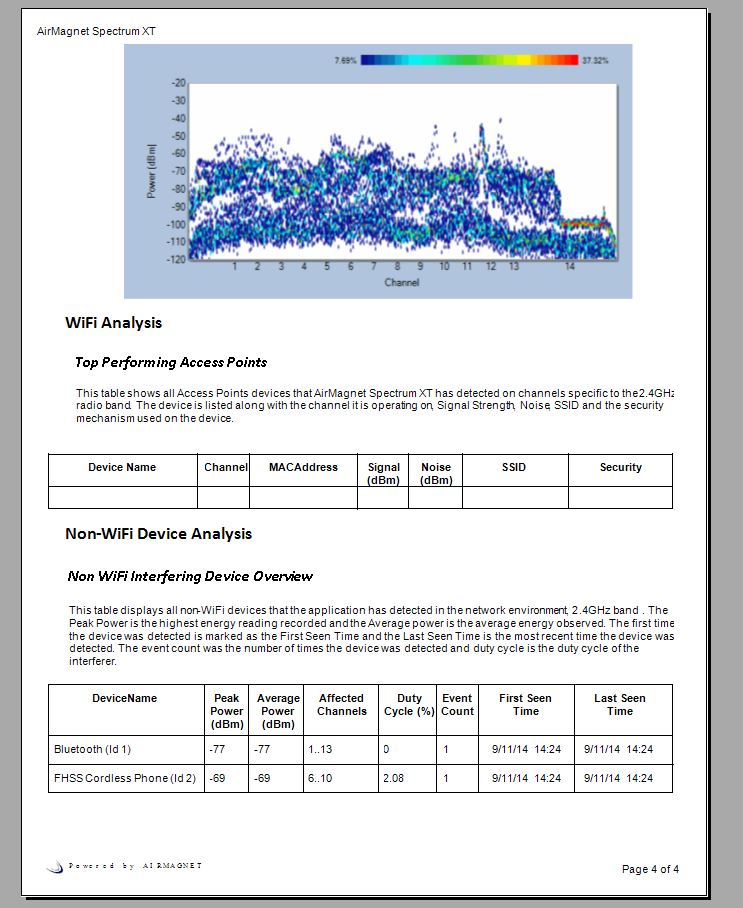 AirMagnet Spectrum XT 頻譜分析儀的集成報告引擎很容易將 RF 頻譜分析過程轉(zhuǎn)化為專業(yè)報告。此 Wi-Fi 頻譜分析儀配有自定義功能,可以為當(dāng)前環(huán)境生成 RF 頻譜圖、Wi-Fi 圖表和 RF 干擾源列表等報告。利用無線頻譜分析儀,報告可以 Word、RTF、PDF、HTML 格式導(dǎo)出和傳送。