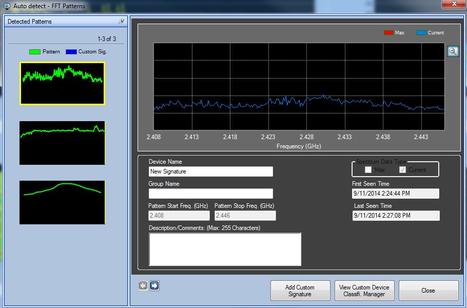 為了克服這一障礙,并為用戶提供對任何 RF 干擾源的“零天”回應(yīng),AirMagnet 無線頻譜分析儀推出業(yè)界第一個自動化頻譜分析功能,它可以監(jiān)測 RF 環(huán)境,從這些“未知的 RF 干擾源”中尋找獨(dú)特和重復(fù)的 RF 模式。檢測到相關(guān) RF 干擾模式并進(jìn)行分類后,用戶就可以對該模式創(chuàng)建自定義簽名,以便在將來發(fā)出警報。利用此無線頻譜分析功能,用戶可以不依賴于供應(yīng)商的定期分類更新,還可以更快地排除他們網(wǎng)絡(luò)中的性能問題。