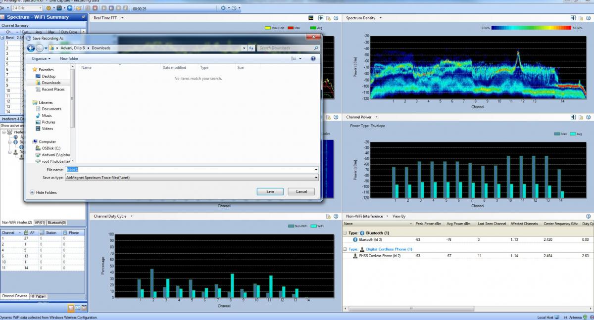 Wi-Fi 頻譜分析儀用戶也可獲得非 Wi-Fi 干擾源的詳細(xì)信息,包括峰值和平均功率、首次和最后看到的時間、中心頻率、受影響的信道、干擾源被偵測到的次數(shù)等等。借助另一部被插入同一 PC 的藍(lán)牙適配器,AirMagnet Wi-Fi 頻譜分析儀可提供藍(lán)牙的 ID、名稱、服務(wù)等信息,以便進(jìn)行高級藍(lán)牙干擾源分析。
