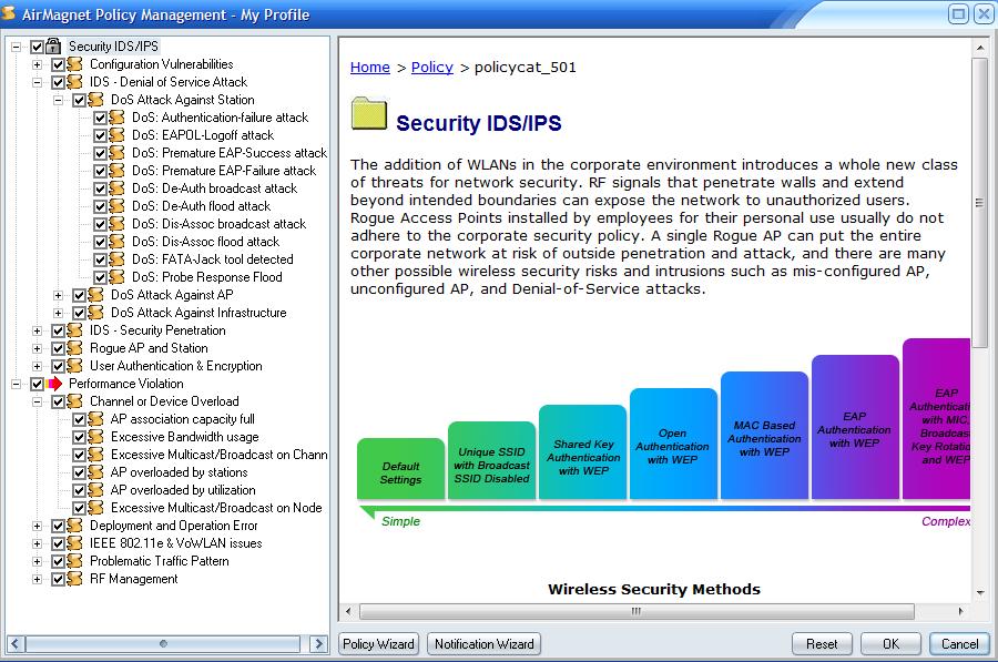 AirMagnet WiFi Analyzer 可自動(dòng)檢測(cè)數(shù)十種無(wú)線侵入、滲透嘗試和 Wi-Fi 黑客攻擊(包括惡意設(shè)備、 “過(guò)失工具”,發(fā)送未加密的數(shù)據(jù)的工具及許多可能帶來(lái)危害的無(wú)線安全配置),并向用戶發(fā)出提示。這些主動(dòng)措施使得 IT 部門能夠在問(wèn)題發(fā)生之前采取糾正措施。AirMagnet WiFi Analyzer PRO 版還能檢測(cè)出針對(duì)網(wǎng)絡(luò)的復(fù)雜無(wú)線攻擊。AirMagnet WiFi Analyzer 的發(fā)現(xiàn)工具能夠鎖定惡意的或違反規(guī)定的接入點(diǎn)或終端設(shè)備,并引導(dǎo)用戶扎到它們的實(shí)際位置。