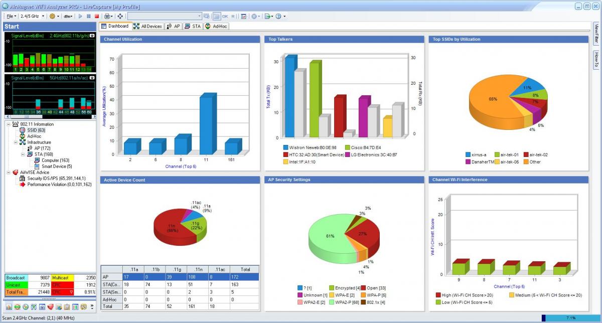AirMagnet WiFi Analyzer 可為用戶提供全套設(shè)備診斷,包括在無(wú)線環(huán)境中運(yùn)行的 AP、客戶端和智能設(shè)備。對(duì)于每種設(shè)備,用戶都可獲得詳細(xì)的配置信息和流量統(tǒng)計(jì)。AirMagnet WiFi Analyzer 的顯示板可實(shí)時(shí)顯示無(wú)線網(wǎng)絡(luò)的總體健康狀況,使用戶能夠?qū)⒆⒁饬械叫枰⒖烫幚淼念^等問(wèn)題,確保達(dá)到較大的無(wú)線網(wǎng)絡(luò)安全性和性能。為用戶提供各種圖表,包括信道利用率、網(wǎng)絡(luò)中首要會(huì)話設(shè)備、無(wú)線網(wǎng)絡(luò)干涉水平、不匹配配置、過(guò)載的 AP、安全和性能問(wèn)題等圖表。用戶能夠?qū)γ總€(gè)設(shè)備的 WLAN 統(tǒng)計(jì)、信道和無(wú)線幀進(jìn)行深入調(diào)查分析。它幫助用戶把精力放在關(guān)鍵方面,避免為了做高級(jí)分析而去深入研究應(yīng)用程序。這樣用戶在診斷網(wǎng)絡(luò)問(wèn)題時(shí)可以節(jié)省大量時(shí)間和精力。