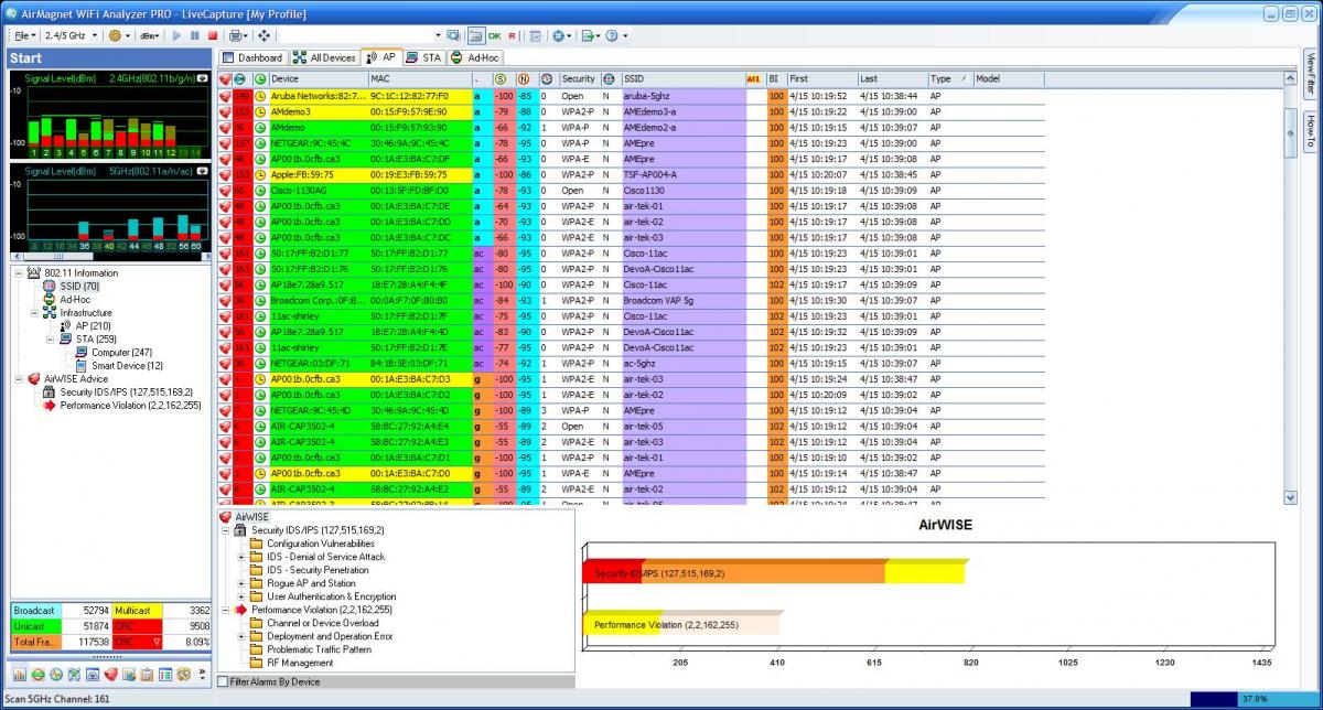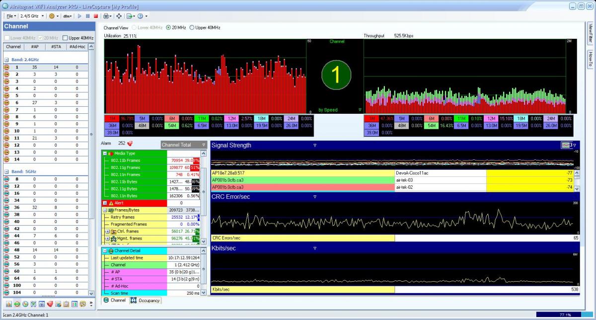 除通過(guò) AirWISE 即時(shí)提供答案外,AirMagnet WiFi Analyzer 為在頻譜中運(yùn)行的每個(gè)信道和每個(gè)設(shè)備都提供了詳細(xì)的幀統(tǒng)計(jì)。利用信道利用和吞吐量趨勢(shì)圖,用戶可對(duì)很多降低無(wú)線網(wǎng)絡(luò)整體性能的問(wèn)題進(jìn)行故障排除。AirMagnet WiFi Analyzer 用戶可查看每條無(wú)線網(wǎng)絡(luò)信道和每個(gè)設(shè)備的各種趨勢(shì)圖,如信號(hào)強(qiáng)度、噪聲、幀、錯(cuò)誤、重試,帶寬等。這些重要的網(wǎng)絡(luò)監(jiān)控圖表提供了關(guān)鍵信息,用于幫助用戶對(duì)影響無(wú)線網(wǎng)絡(luò)性能的問(wèn)題進(jìn)行問(wèn)題排除。例如,數(shù)據(jù)包重試和錯(cuò)誤率圖能夠告訴用戶哪個(gè)區(qū)域的無(wú)線網(wǎng)絡(luò)通信出現(xiàn)故障。在 AirMagnet WiFi Analyzer 的解碼屏幕上,用戶可以查看和分析實(shí)時(shí)的數(shù)據(jù)包列表,包括 3X3 802.11n 和 3X3 802.11ac 數(shù)據(jù)包,也包括監(jiān)控上層協(xié)議的支持。AirMagnet WiFi Analyzer 為用戶提供了應(yīng)用過(guò)濾器的選擇,如基于一個(gè)特定的信道、SSID、節(jié)點(diǎn)、IP 地址或幀類型,以隔離感興趣的特定數(shù)據(jù)包??山饷?WPA-PSK 和 WPA2-PSK 加密的數(shù)據(jù)包。憑借著 AirMagnet WiFi Analyzer PRO 的多適配器支持,用戶可將各個(gè)適配器與同一 PC 相連,從而實(shí)現(xiàn)同時(shí)監(jiān)控多條信道的目的。