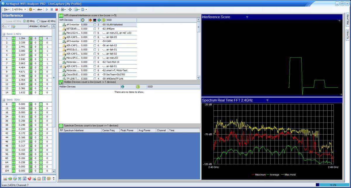 干擾是網(wǎng)絡(luò)連接不穩(wěn)定和性能問(wèn)題的主要原因之一。干擾的發(fā)生可能是由于其他 Wi-Fi 設(shè)備不當(dāng)?shù)男诺酪?guī)劃(同信道干擾或鄰信道干擾)或者非 Wi-Fi 干擾源造成的。Wi-Fi 干涉的發(fā)生可能是由于和其他公司或周圍 WLAN 存在同信道干擾和鄰信道干擾,環(huán)中有暗藏的節(jié)點(diǎn),或者 802.11 頻帶中有正在工作的非 Wi-Fi 設(shè)備。AirMagnet WiFi Analyzer 的干擾狀態(tài)顯示屏上將列出每個(gè) Wi-Fi 信道的整體干擾狀態(tài)(對(duì)造成干擾的設(shè)備,根據(jù) Wi-Fi 干擾計(jì)算得分)還將列出信道中處于運(yùn)行狀態(tài)的隱藏節(jié)點(diǎn)和非 Wi-Fi 設(shè)備(非 Wi-Fi 檢測(cè)要求計(jì)算機(jī)上同時(shí)裝有 AirMagnet WiFi Analyzer Pro 和 RF 頻率分析儀。這使得用戶可以輕松規(guī)劃將來(lái)的 Wi-Fi 部署,或修改現(xiàn)有部署來(lái)減少干擾并提高網(wǎng)絡(luò)性能。