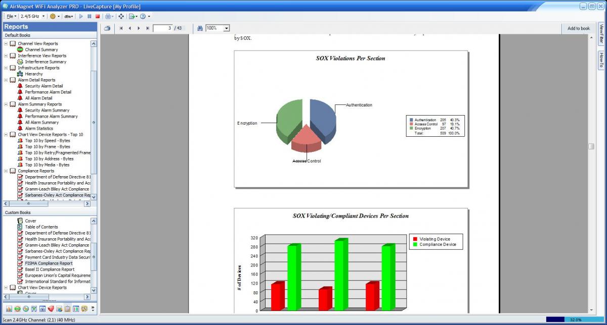 使用 AirMagnet WiFi Analyzer Pro 集成的報(bào)告器,您可以輕松地把 Wi-Fi 分析會(huì)話變成專業(yè)定制的 Wi-Fi 網(wǎng)絡(luò)監(jiān)控報(bào)告。您可以從用戶界面選擇預(yù)先建立好的報(bào)告,或者選擇特定項(xiàng)目來(lái)生成目標(biāo)報(bào)告。Wi-Fi 網(wǎng)絡(luò)監(jiān)控報(bào)告內(nèi)容涵蓋管理的各個(gè)方面,包括 RF 統(tǒng)計(jì)、渠道報(bào)告、設(shè)備報(bào)告、安全或者性能問(wèn)題報(bào)告和各種法定標(biāo)準(zhǔn)(如 HIPAA、PCI、SOX、DoD 8100.2、FISMA 等)的合規(guī)性報(bào)告。對(duì)于合規(guī)性報(bào)告,我們可以引導(dǎo)您對(duì)標(biāo)準(zhǔn)的各個(gè)部分進(jìn)行詳細(xì)的通過(guò)/失敗評(píng)估,其中包含各個(gè)設(shè)備是否合規(guī)的詳細(xì)信息。