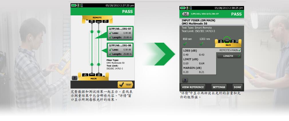 在測(cè)試結(jié)果屏幕上同時(shí)查看所測(cè)各光纖的結(jié)果和通過(guò)/失敗狀態(tài)。輕松識(shí)別光纖類型、測(cè)試限值、損耗以及與各結(jié)果相關(guān)的光纖。所有良好結(jié)果用綠 色圖標(biāo)顯示,故障事件用紅色圖標(biāo)顯示,且光纖帶有輸入或輸出標(biāo)記以方便快速識(shí)別和糾正錯(cuò)誤的跳線連接。