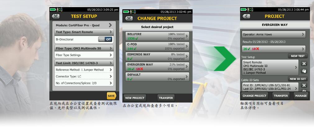 作為 Versiv 系列的一員,CertiFiber Pro OLTS 中引入了 ProjX,以方便工作設(shè)置、減少測(cè)試值選擇錯(cuò)誤并更好地管理多個(gè)項(xiàng)目。項(xiàng)目經(jīng)理和 技術(shù)人員可為不同的作業(yè)、位置或客戶創(chuàng)建新項(xiàng)目名稱并輕松為各作業(yè)提前定義項(xiàng)目要求 - 包括所有測(cè)試參數(shù)和線纜 ID - 然后跟蹤作業(yè)進(jìn)展即 可。所有項(xiàng)目詳細(xì)信息均儲(chǔ)存在 LinkWare 中,以方便傳輸?shù)狡渌?Versiv 線纜認(rèn)證測(cè)試儀。