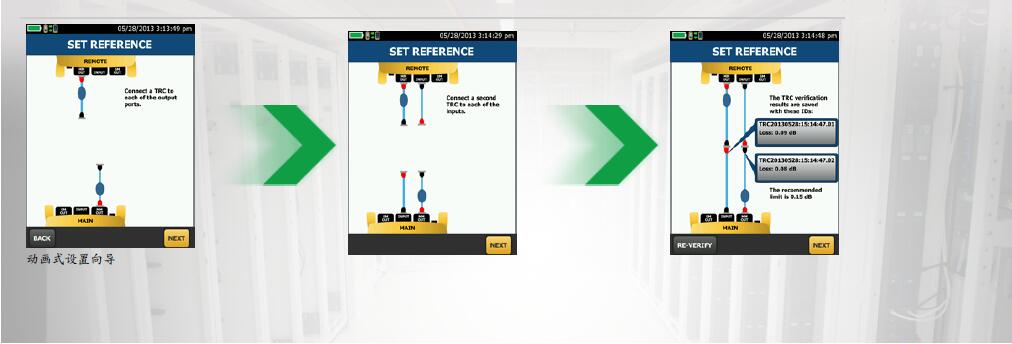 設(shè)置參考值已不再是難題。CertiFiber Pro OLTS 具備設(shè)置參考向?qū)Чδ?,可圖示化引導(dǎo)技術(shù)人員完成參考的設(shè)置并檢查測(cè)試參考導(dǎo)線。這種動(dòng)畫(huà)