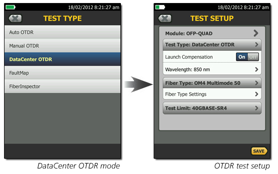只需簡單的一鍵選擇,用戶即可進入 DataCenter OTDR 模式 - 無需再進行 OTDR 的設(shè)置。DataCenter OTDR 模式自動檢測 OTDR 參數(shù) - 端點檢測算法,脈沖寬度等 - 而不會被短連接或連接器的數(shù)量干擾。