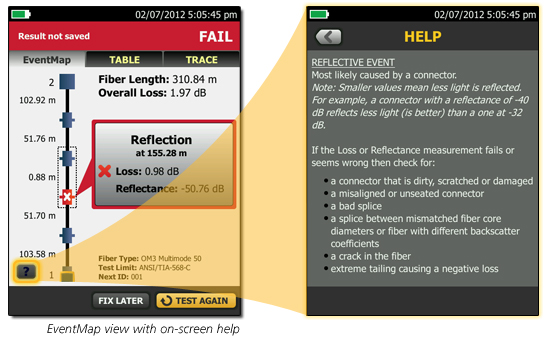 屏幕“幫助”可在各測試步驟中顯示用于解決光纖問題的修正措施建議。這些“幫助”是與環(huán)境相關(guān)的,使用戶能夠迅速找到可能的解決方案。左下角灰色圖標中清晰地顯示了詳細的修正措施建議。