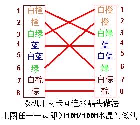 同時(shí),我們也應(yīng)該知道,級(jí)連HUB間的網(wǎng)線長(zhǎng)度不應(yīng)超過(guò)100米, HUB的級(jí)連不應(yīng)超過(guò)4級(jí)。因交叉線較少用到,故應(yīng)做特別標(biāo)記,以免日后誤作直通線用,造成線路故障。另外交叉網(wǎng)線也可用在兩臺(tái)微機(jī)直連。