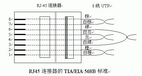 標(biāo)準(zhǔn)568B:橙白--1,橙--2,綠白--3,藍(lán)--4,藍(lán)白--5,綠--6,棕白--7,棕--8;