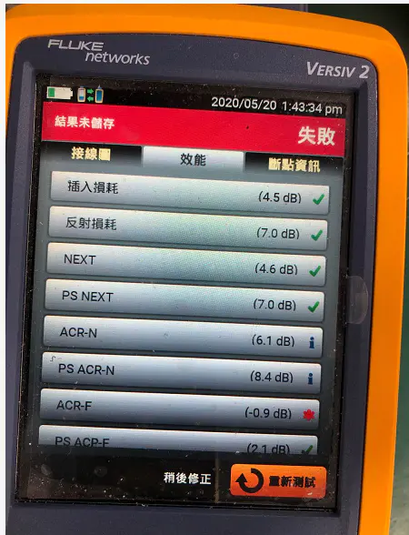 ACR-F一對雙絞線的接收的信號包含兩個部分,一是對端發(fā)射過來的信號,這個信號要經(jīng)過整條鏈路,所以會收到線對的插入損耗也就是衰減參數(shù)的影響,所以這個信號準(zhǔn)確的來講就是經(jīng)過衰減的有用信號,二就是其他線對的串?dāng)_信號,包含近端串?dāng)_信號NEXT和遠(yuǎn)端串?dāng)_信號FEXT。還有其他的外來干擾的噪聲信號,稱為外部串?dāng)_。ACR-N是近端衰減串?dāng)_比,所以是衰減值比上近端串?dāng)_值得出。我們把這個公式變化一下,就等于VR接收電平比上VT發(fā)送電平的出來的數(shù)值再比上VX串?dāng)_電平比上VT發(fā)送電平的得出來的數(shù)值,分母VT約掉得出VR發(fā)送電平比上VX串?dāng)_電平,近似于信號噪聲比的概念。剛才我們提到了端口收到的串?dāng)_信號除了近端串?dāng)_還有遠(yuǎn)端串?dāng)_,干擾發(fā)生在整個鏈路中,信號會沿著線纜兩個方向都會進行傳輸,傳輸?shù)叫盘柊l(fā)射端會產(chǎn)生近端串?dāng)_NEXT,傳輸?shù)叫盘柦邮斩水a(chǎn)生的就是遠(yuǎn)端串?dāng)_FEXT。用來衡量遠(yuǎn)端串?dāng)_對有效信號影響的參數(shù)就是ACR-F。ACR-F的計算方法和ACR-N的計算方法類似,只是把近端串?dāng)_電平換為遠(yuǎn)端串?dāng)_電平就可以得到計算結(jié)果類似于NEXT和PS NEXT的關(guān)系,單純的ACR-N和ACR-F也不能表示數(shù)據(jù)接收端口綜合的信噪比。因為我們在計算的過程中只取了一對線纜的干擾電平,實際應(yīng)用中每一對雙絞線信號接收端口要收到其他三對線纜的干擾信號,那么PS ACR-N的計算是經(jīng)過衰減的有用信號比上其他三對下線纜的干擾噪聲總和,才能表示實際的可用帶寬,那么取其他三個線對的近端串?dāng)_的參數(shù)相加計算得到的參數(shù)就是PS ACR-N。利用DSX8000如何更好的理解ACR-F失敗。